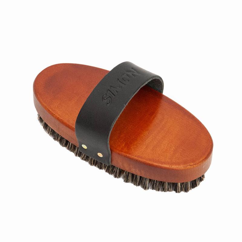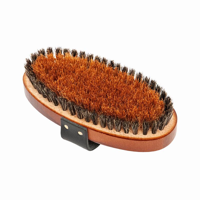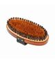 Owalna szczotka kokosowa firmy Mati, wykonana z włókna kokosowego i szczeciny świńskiej. Długość 18 cm.