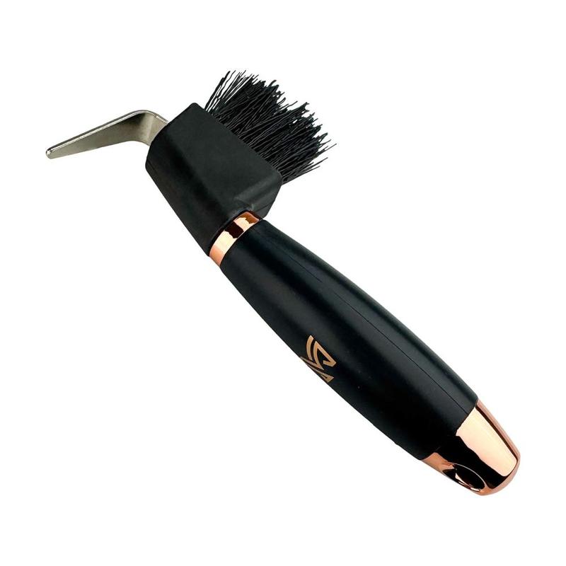 Praktyczna i stylowa kopystka w eleganckiej czerni z dodatkami w kolorze różowego złota. Solidna i trwała konstrukcja oraz ergonomiczny uchwyt z żelu zapewniają wygodę podczas codziennego czyszczenia kopyt. Elegancki design sprawia, że kopystka idealnie komponuje się z innymi produktami z serii Melody.