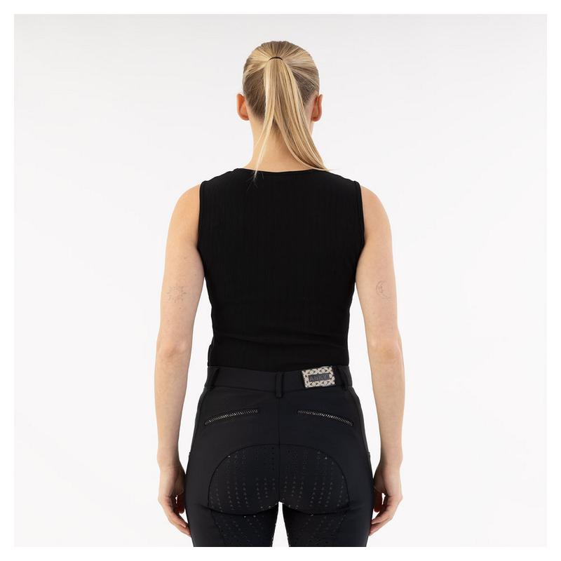 Top Anky wykonany z oddychającej prążkowanej tkaniny. Kryształki na lewej przedniej części bluzki. Rozmieszczenie prążków w różnych kierunkach