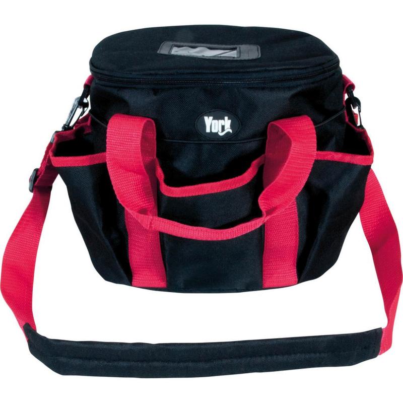 Torba na akcesoria firmy York. Wyposażona w jedną większą komorę zamykaną na zamek oraz sześć mniejszych kieszonek idealnych do przechowywania akcesoriów do pielęgnacji konia. Torba posiada wygodny, regulowany pasek na ramię oraz nóżki na dnie które zapobiegają jej brudzeniu się. Całość zrobiona z poliestru.