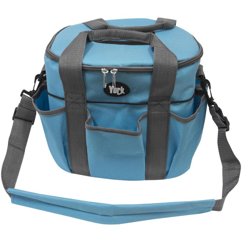 Torba na akcesoria firmy York. Wyposażona w jedną większą komorę zamykaną na zamek oraz sześć mniejszych kieszonek idealnych do przechowywania akcesoriów do pielęgnacji konia. Torba posiada wygodny, regulowany pasek na ramię oraz nóżki na dnie które zapobiegają jej brudzeniu się. Całość zrobiona z poliestru.