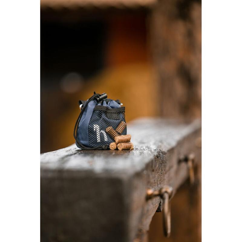 Torebka - sakiewka na smakołyki firmy Horze. Duża przegroda z troczkami ze stoperem. Siateczkowa kieszonka z przodu. Karabińczyk do przypięcia do szlufki.