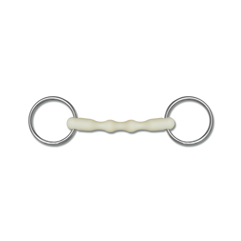 Wędzidło proste Happy Mouth firmy Waldhausen. Pierścienie wykonane ze stali nierdzewnej, natomiast ścięgierz ze tworzywa sztucznego o smaku jabłka, które skutecznie zachęca do żucia