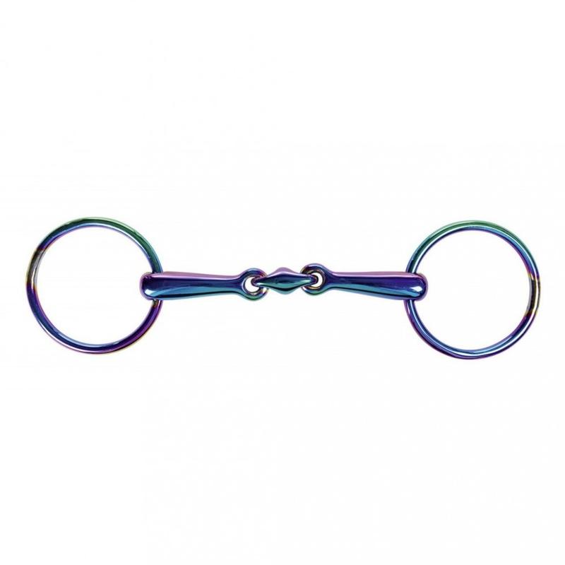 Wędzidło podwójnie łamane Rainbow firmy HKM. Wykonane z nierdzewnej stali szlachetnej. Dzięki zastosowaniu odpowiedniego stopu wędzidło pod wpływem ciepła powoduje zmianę koloru. Grubość: 16 mm Średnica pierścieni: 60 mm.