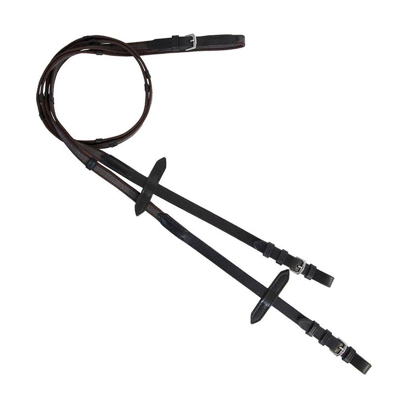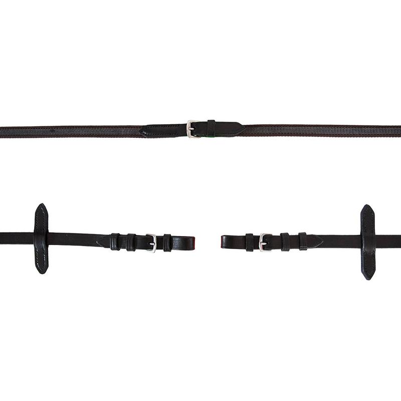 Wodze z taśmy angielskiej firmy Parkur. Wykonane z taśmy wzmocnionej gumą. Wyposażone w stopery dla jeszcze lepszego trzymania. Zakończone przystułkami ze skóry naturalnej. Produkt Polski