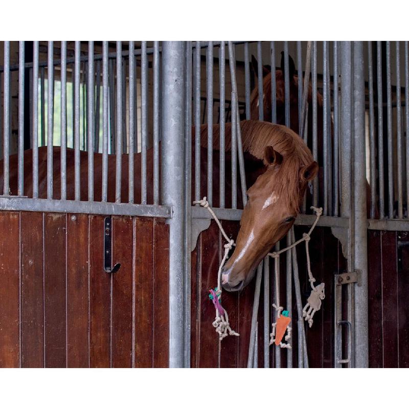 Zabawka konik do powieszenia w stajni lub na wybiegu. Możesz łatwo przymocować marchewki za pomocą elastycznych pętelek. Zapewnia to jeszcze więcej zabawy dla Twojego konia i zapobiega stresowi i nudzie.
