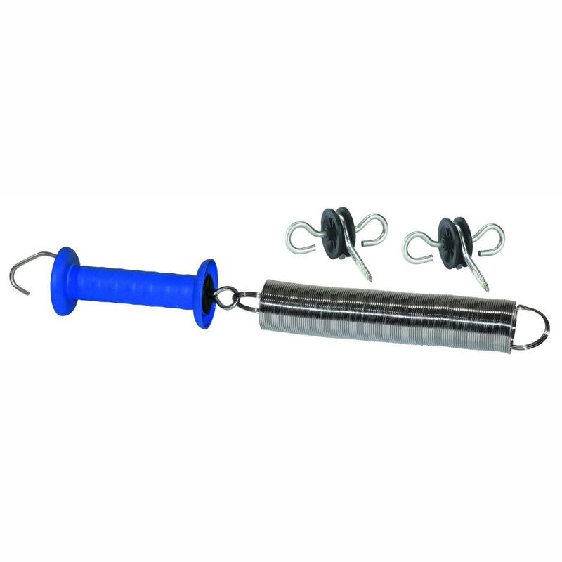 Zestaw zawiera uchwyt bramy z rozciągliwym kablem, który umożliwia przepływ prądu po zamknięciu obwodu.W zestawie:- 1 uchwyt bramy z hakiem.- 1 kabel o długości 4,50 m (z możliwością przedłużenia do 9,40 m).- 1 izolator pierścieniowy.- 1 izolator uchwytu bramy.