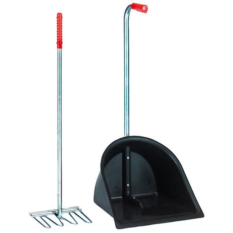 Zestaw do sprzątania boksów firmy Waldhausen. W jego skład wchodzą szufelka i grabki.Wysokość całkowita około 60 cm