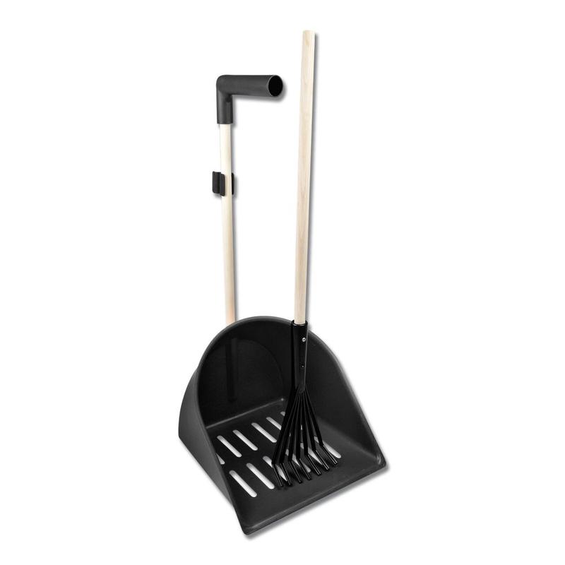 Zestaw do sprzątania boksów firmy Waldhausen. W jego skład wchodzą szufelka i grabki.Wysokość całkowita około 60 cm
