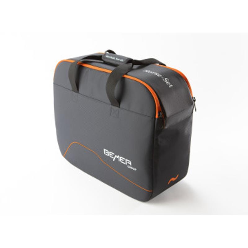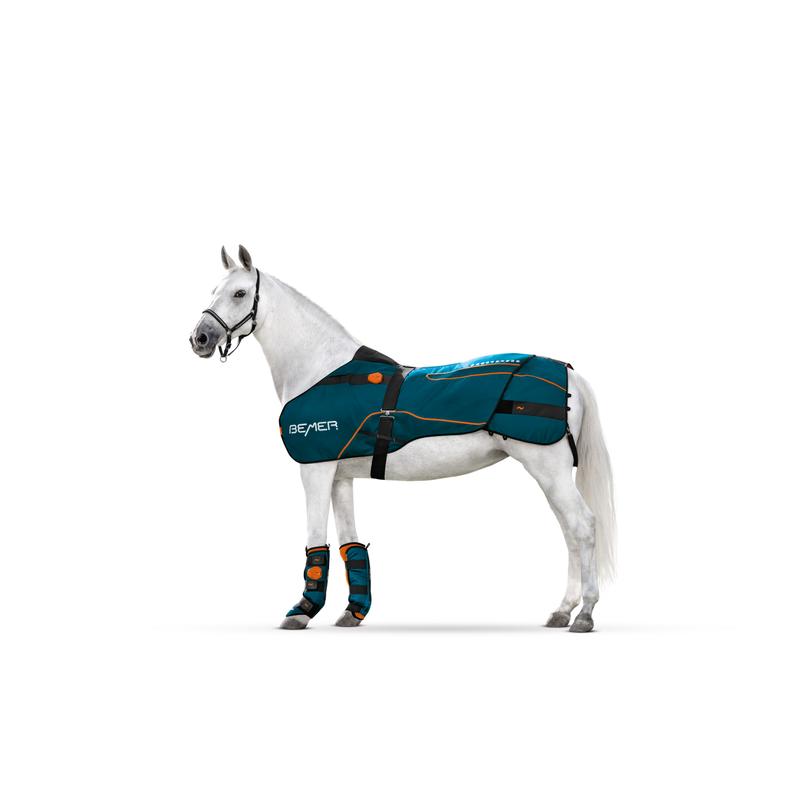 Derka w zestawie BEMER Horse idealnie nadaje się do zastosowań na dużych powierzchniach. Pole sygnału BEMER dociera do wszystkich newralgicznych miejsc na ciele konia. Derka ma ergonomiczny kształt, jest wyposażona w przepuszczające powietrze wkładki, a prosty mechanizm regulacji umożliwia bezproblemowe dopasowanie do budowy ciała konia. Zintegrowana kombinacja akumulatora i sterownika sygnału jest wydajna i umieszczona w miejscu łatwo dostępnym dla człowieka, ale nie dla konia. Drugim, bardzo praktycznym elementem zestawu Horse są dwa ochraniacze ze zintegrowaną kombinacją akumulatora i sterownika sygnału dla lewej i prawej strony, które można umieścić z przodu i z tyłu. Generują one silniejsze, bardziej skupione pole sygnału o działaniu miejscowym. Zestaw BEMER Horse uzupełnia praktyczna torba, derka osuszająca oraz ładowarka z kablem typu Y do jednoczesnego ładowania dwóch urządzeń sterujących; w zestawie znajduje się także międzynarodowy adapter.