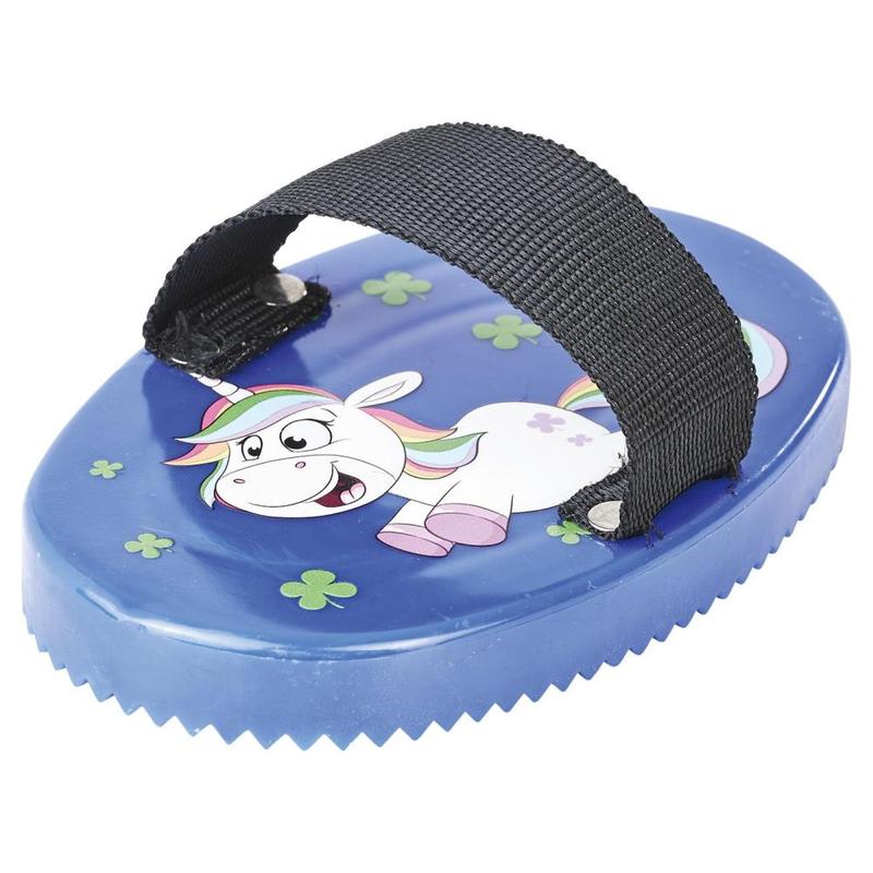 Zgrzebło plastikowe Bunt firmy Busse. Wykonane z tworzywa sztucznego z parcianym paskiem na rękę, by zapobiec wypadaniu z ręki podczas czyszczenia. Ozdobiona interesującym motywem jednorożca.